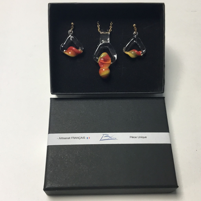 Parure présentée en boîte (carton noir mat) et pochette (velours noir).