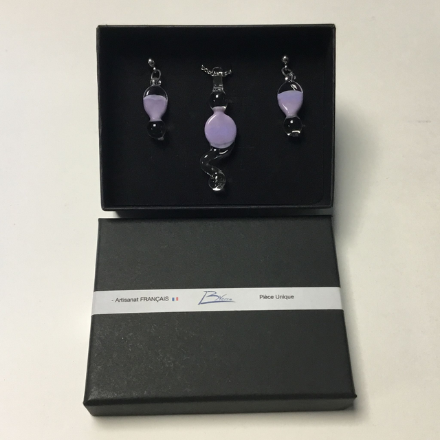 Parure présentée en boîte (carton noir mat) et pochette (velours noir).