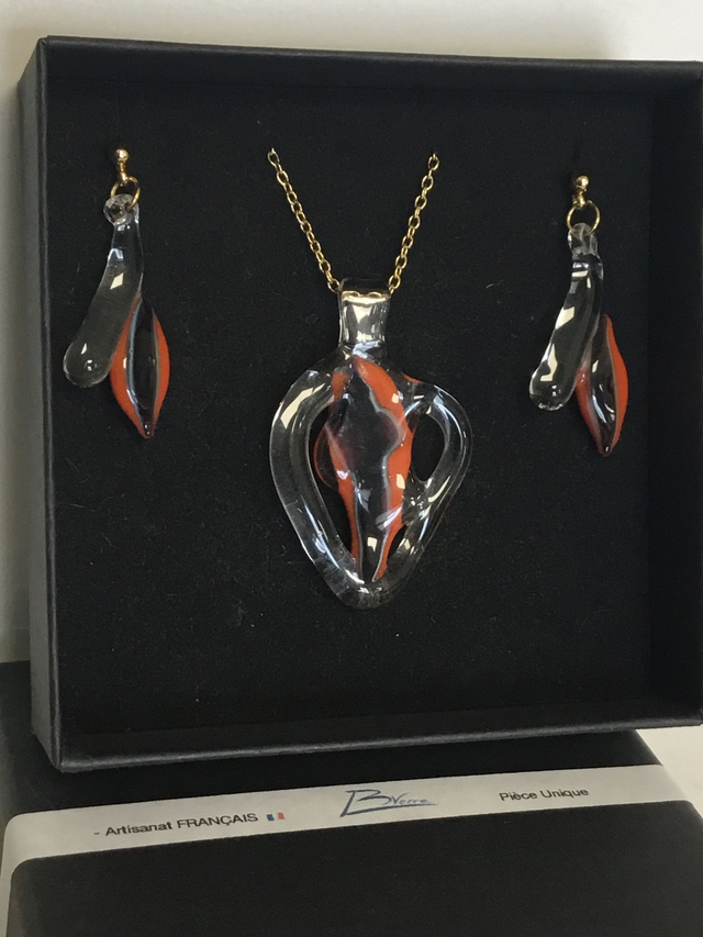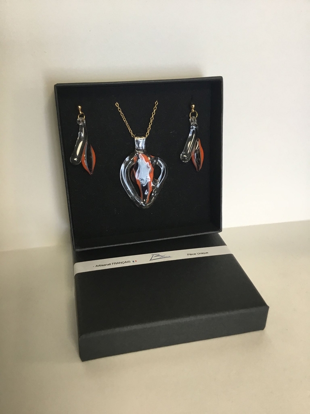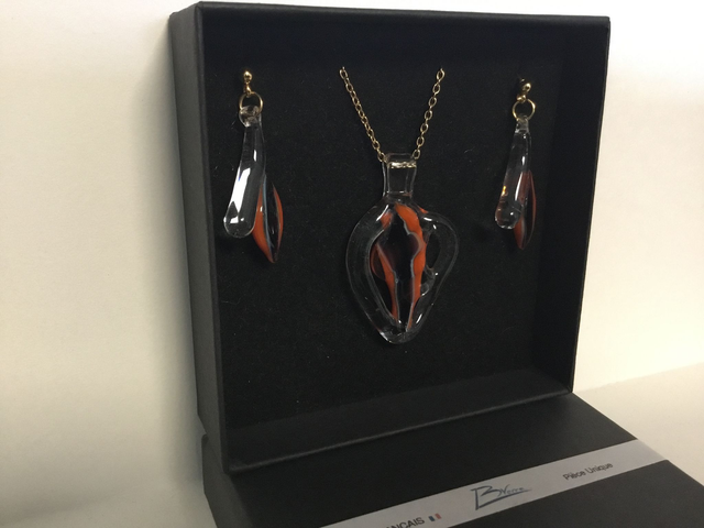 Verre borosilicate transparent, inclusion rouge orangé et verre opaque noir et marbrures grises