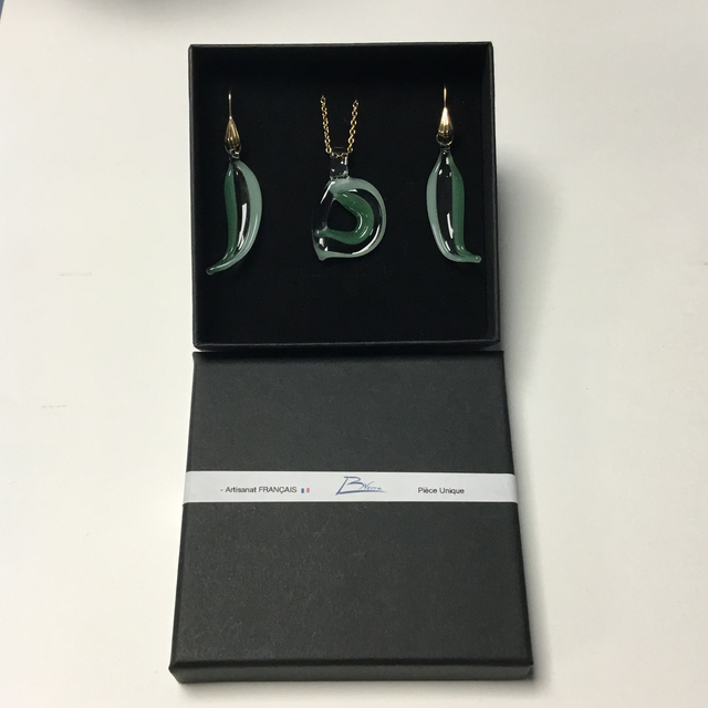 Parure présentée en boîte (carton noir mat) et pochette (velours noir).