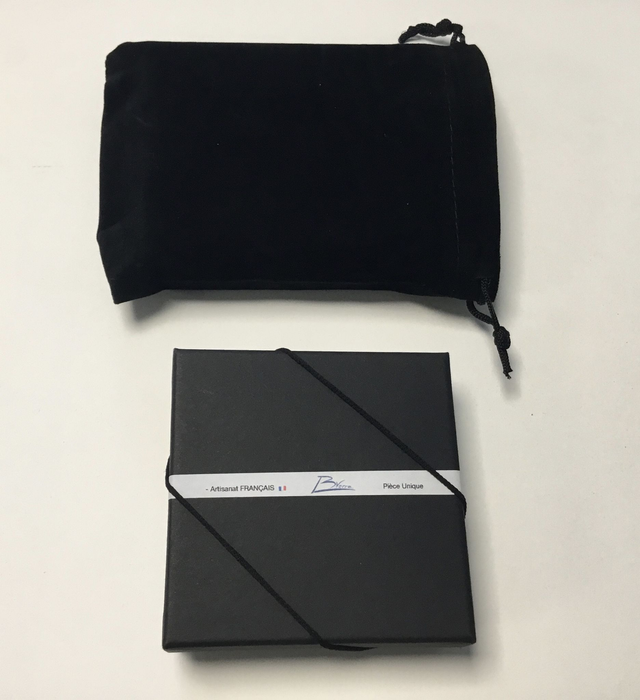 Parure présentée en boîte (carton noir mat) et pochette (velours noir).