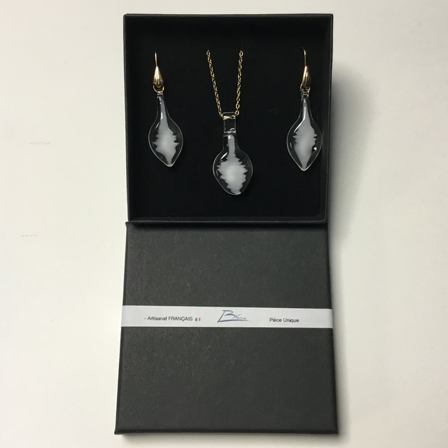 Parure présentée en boîte (carton noir mat) et pochette (velours noir).