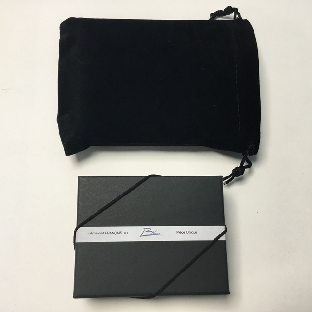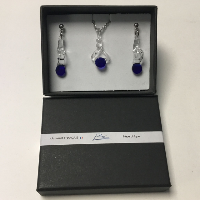Parure présentée en boîte (carton noir mat) et pochette (velours noir).