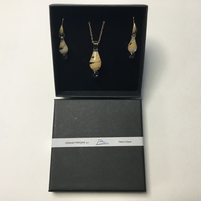 Parure présentée en boîte (carton noir mat) et pochette (velours noir).