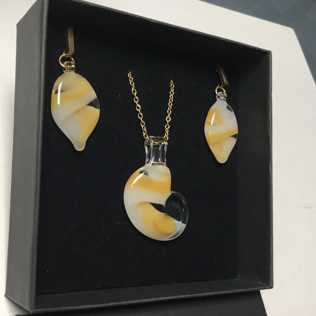 Verre borosilicate transparent et inclusion opaque ivoire et blanc.