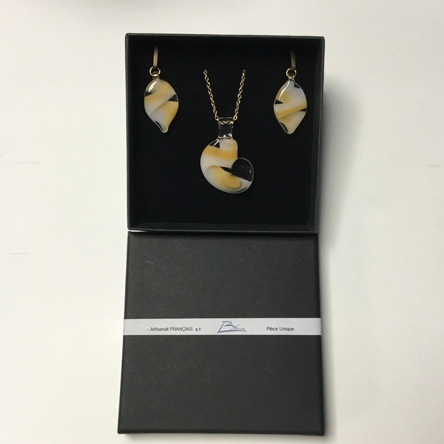 Parure présentée en boîte (carton noir mat) et pochette (velours noir).